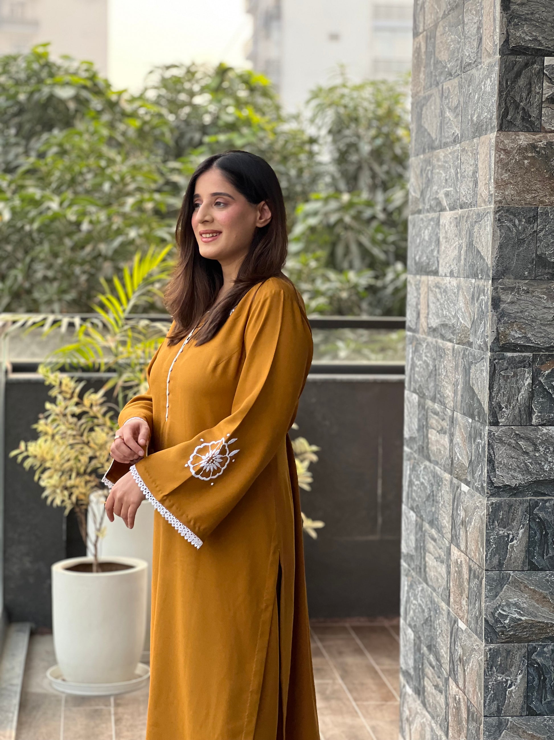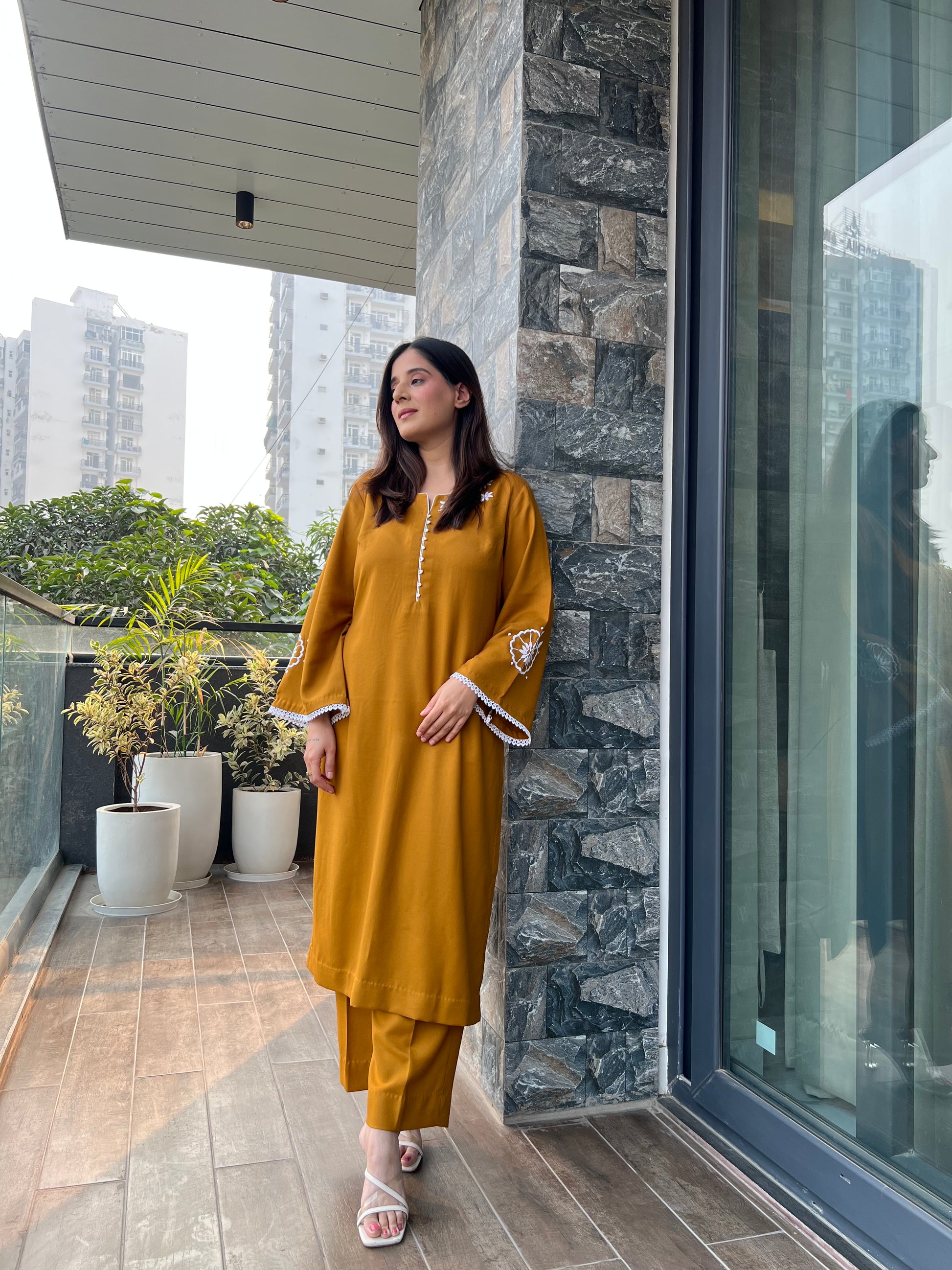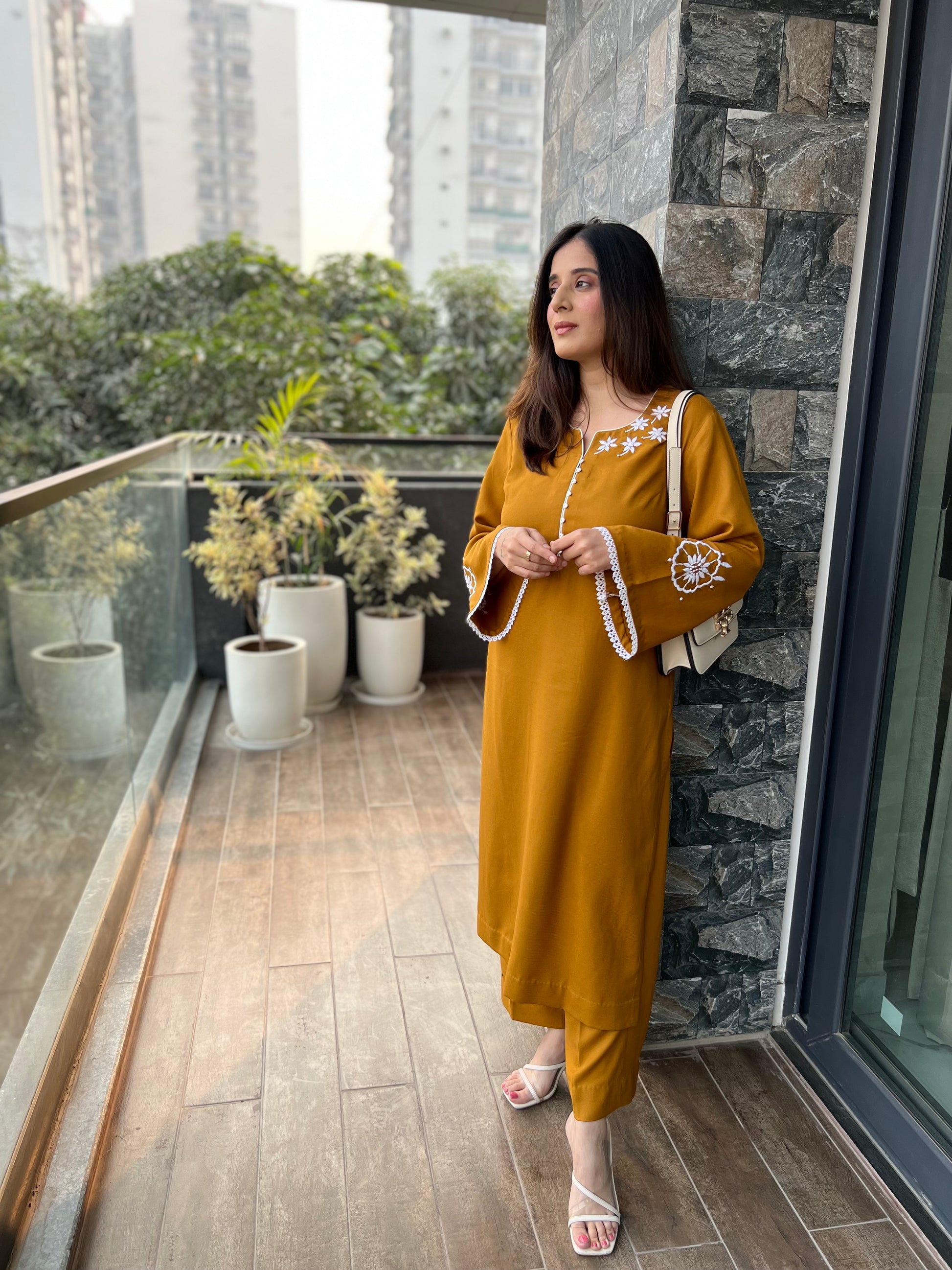 Mustard kurta set in Soft Pashmina Fabric to keep you cozy in winters!